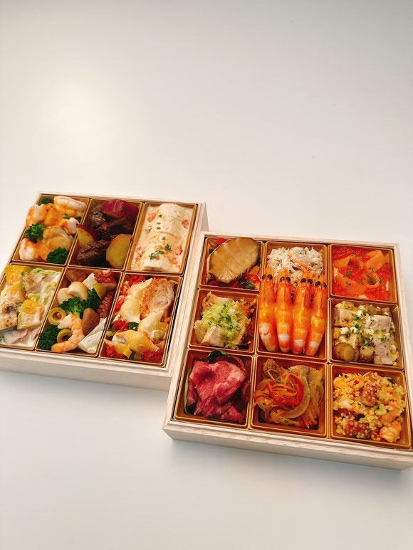 1の重は冷たいオードブル、2の重は温めてお召し上がりいただけるメイン料理の構成になった洋風おせち料理です